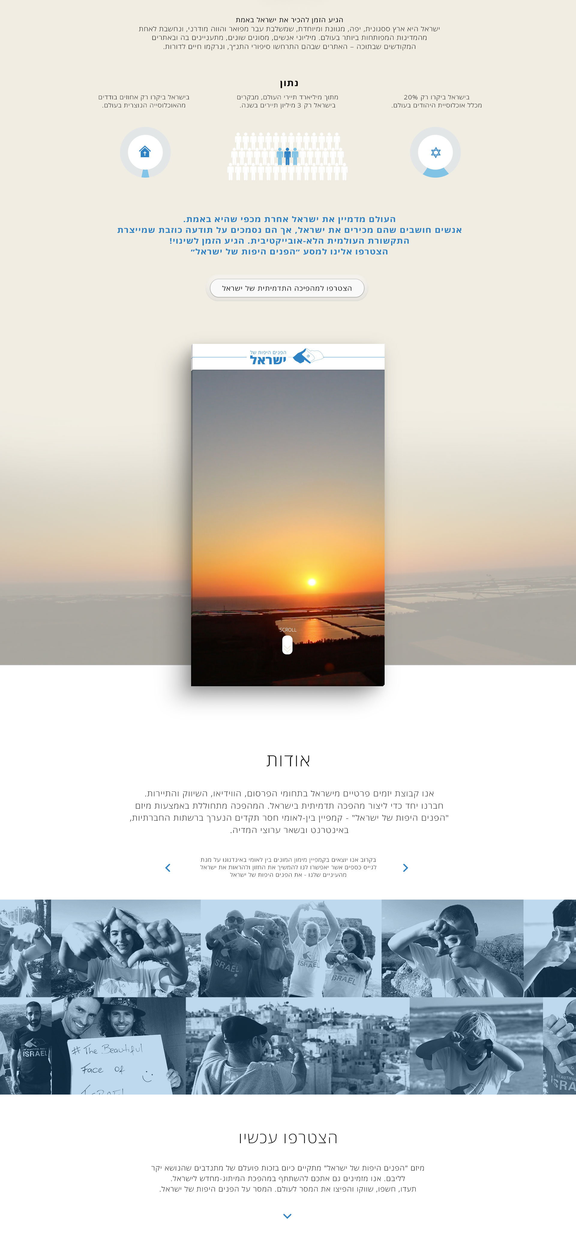 מיזם "הפנים היפות של ישראל" מתרחש כולו ברשת - בפורטל המאגד אלפי סרטוני וידאו, שמציגים את ישראל למיליוני צופים מכל העולם. ישראל היפה, כמו שהיא באמת, בקטגוריות וברבדים שונים: טבע, תרבות, תיירות, קולינריה, פנאי, אקסטרים, אתרים היסטוריים ועוד. המטרה היא לאפשר לעולם להכיר את ישראל ולהבין את הקשר בין עם ישראל לארץ ישראל. החשיפה לסרטונים שבפורטל מעשירה את ידע העולם על ישראל באופן אובייקטיבי ונרחב, ויוצרת שינוי אמיתי בדעת הקהל העולמית באשר לישראל. החשיפה לפורטל תעשה בעזרת קמפיין בין לאומי ובעזרת עשרות אלפי שגרירים של הפנים היפות שמתגייסים מתוך קהילות של אוהבי ישראל מרחבי העולם.